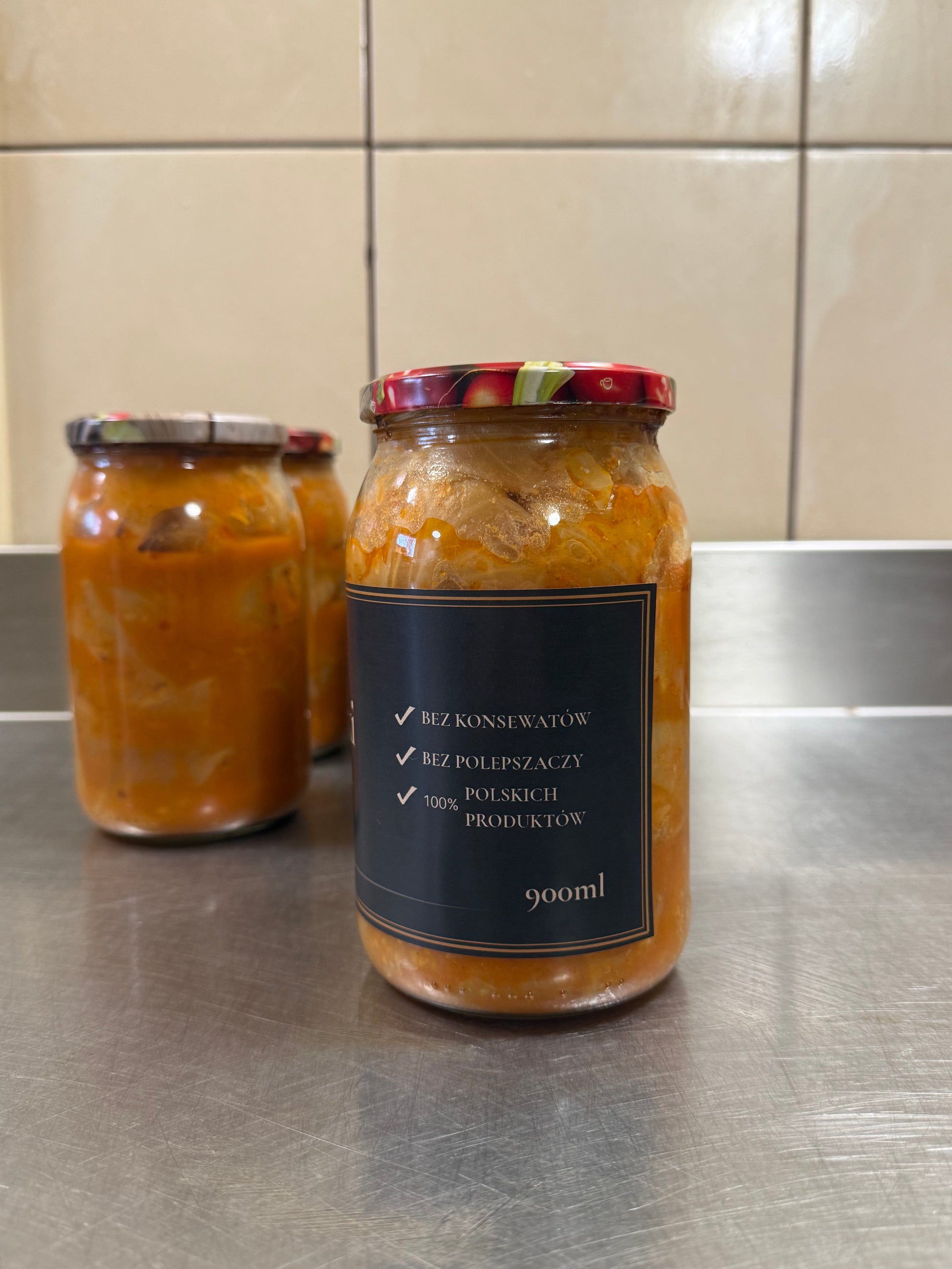 Nasze gołąbki w słoiku w sosie pomidorowym to klasyczna receptura, znana z polskich domów – kapusta, aromatyczny farsz i delikatny sos pomidorowy zamknięte w wygodnym słoiku.