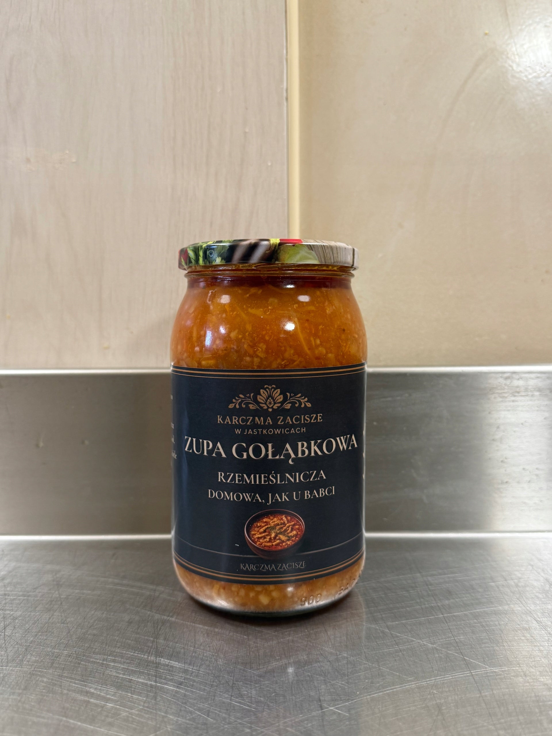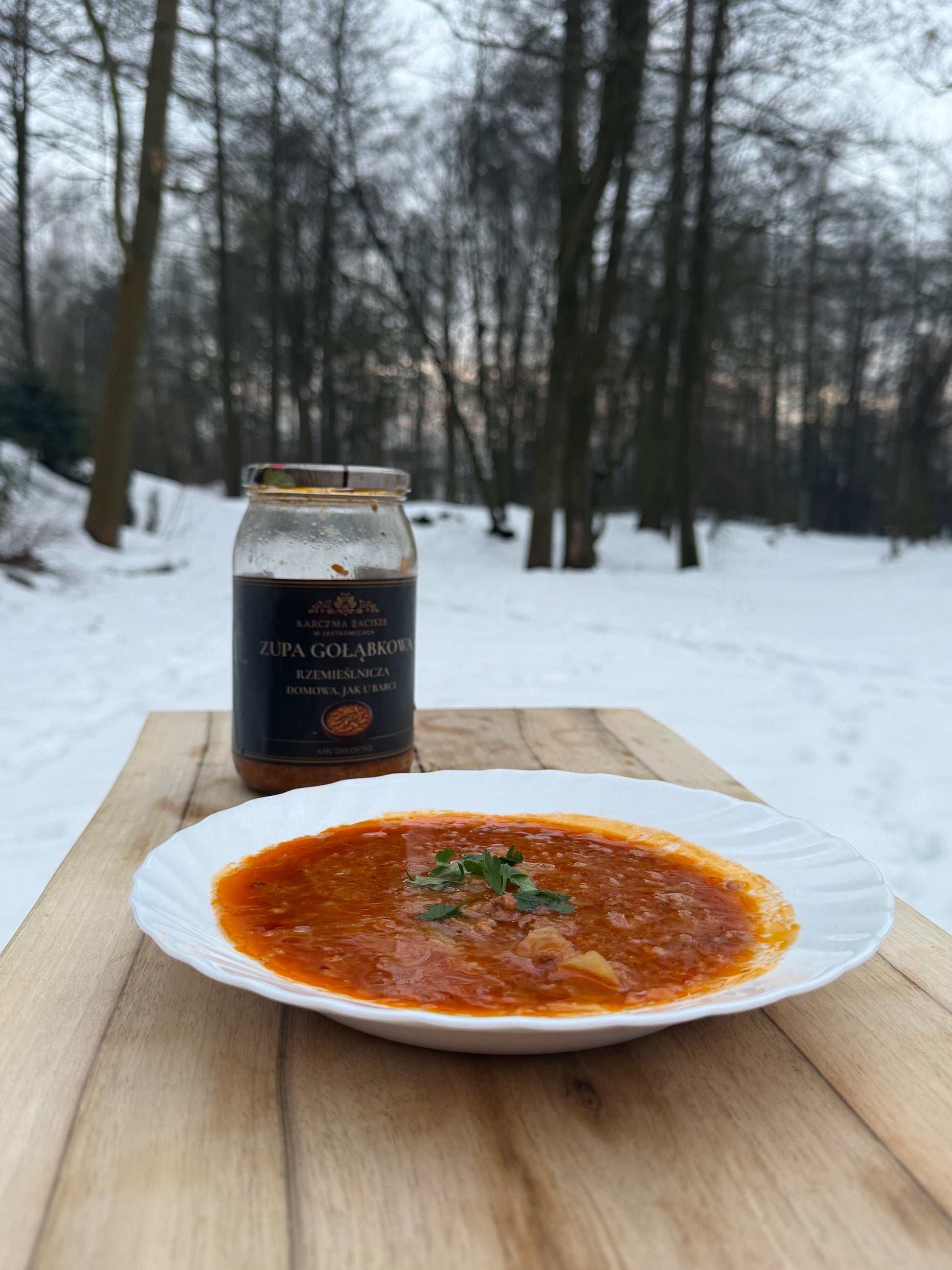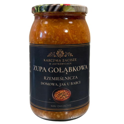 Tradycyjna zupa gołąbkowa w słoiku, przygotowana według domowej receptury. Smakuje dokładnie jak gołąbki, tylko w formie gęstej, sycącej zupy. Idealna na szybki obiad – wystarczy podgrzać.